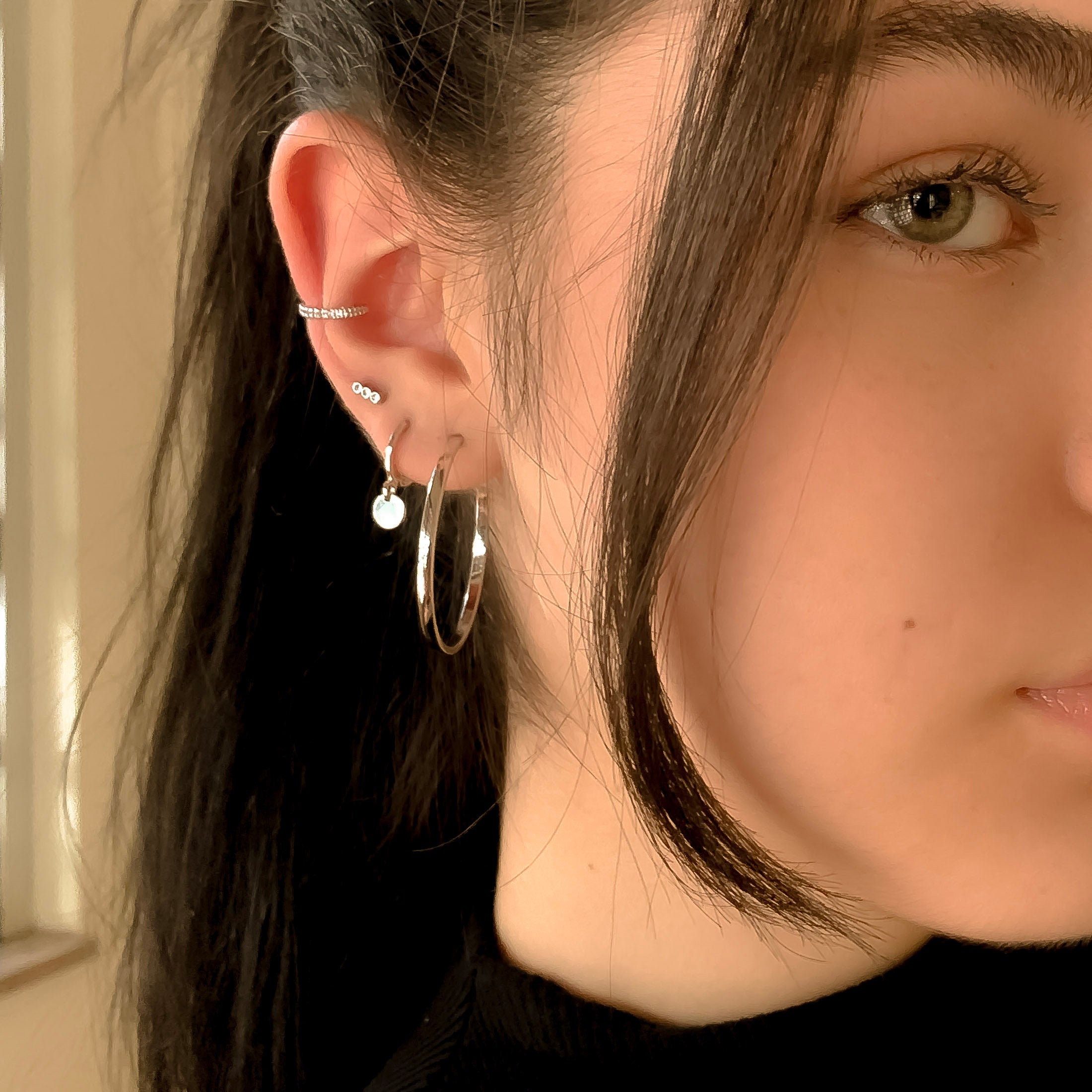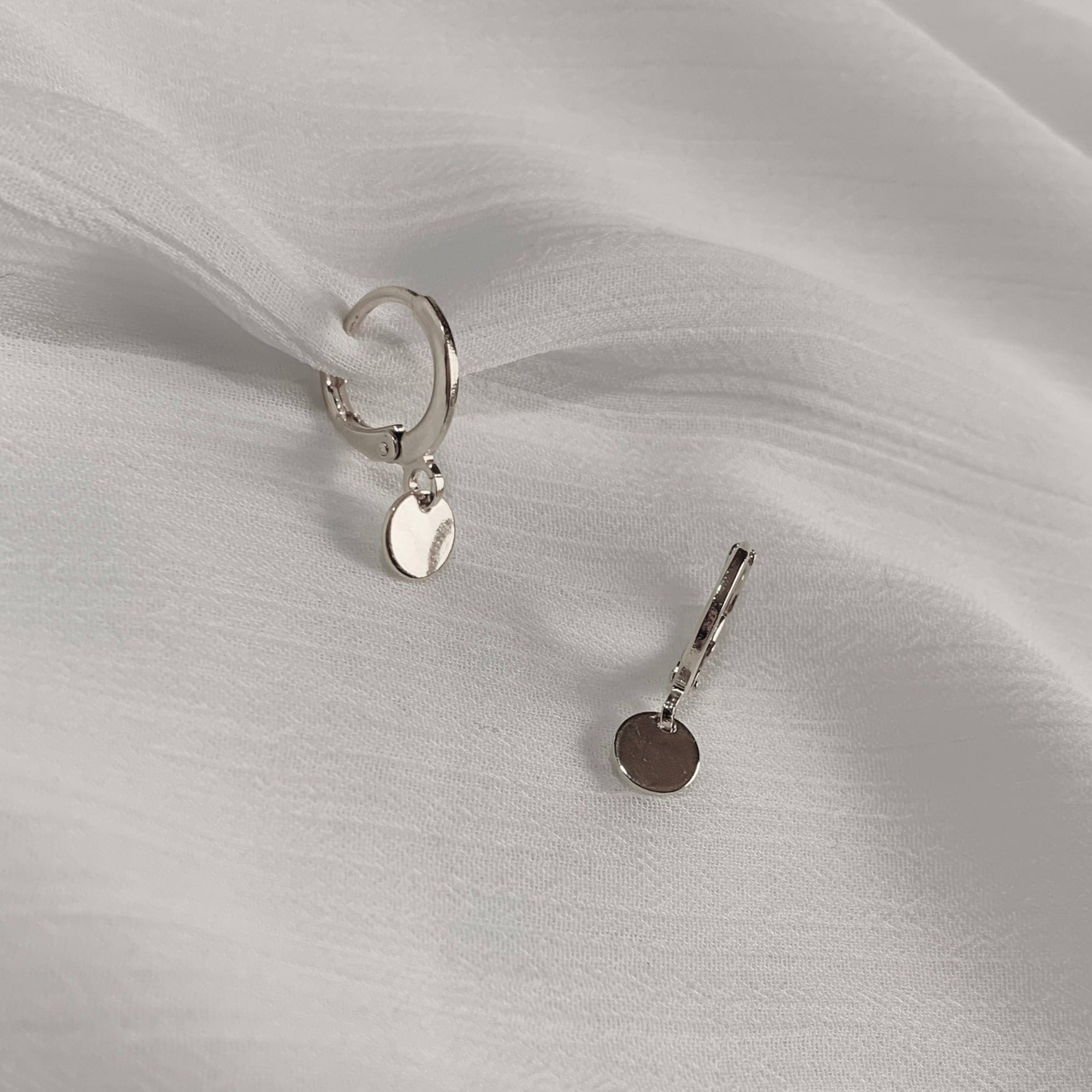 Argola feminina prateada com fecho click e pingente delicado de plaquinha. Modelo super delicado e feminino! Funciona bem no primeiro ou no segundo furo.