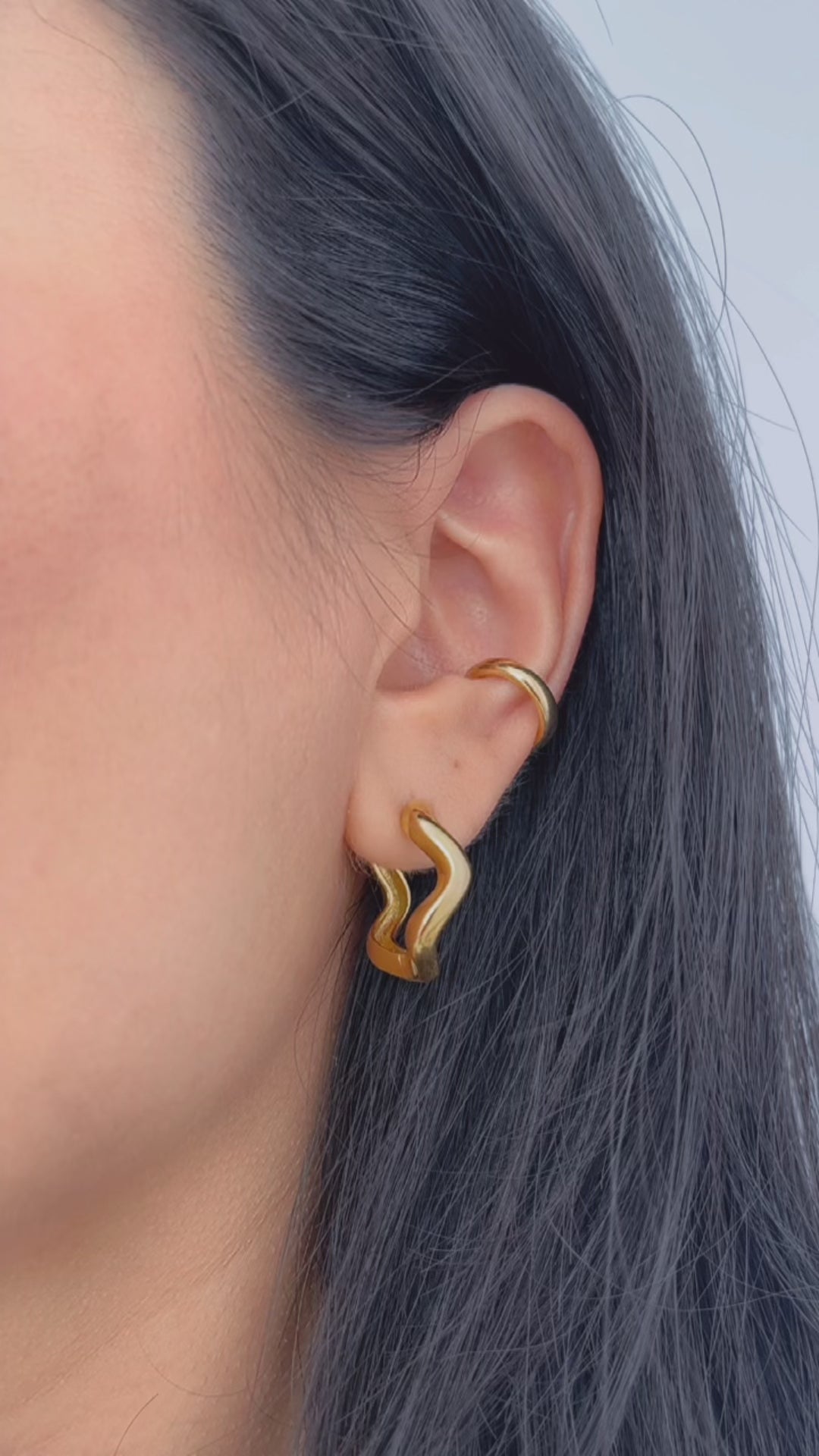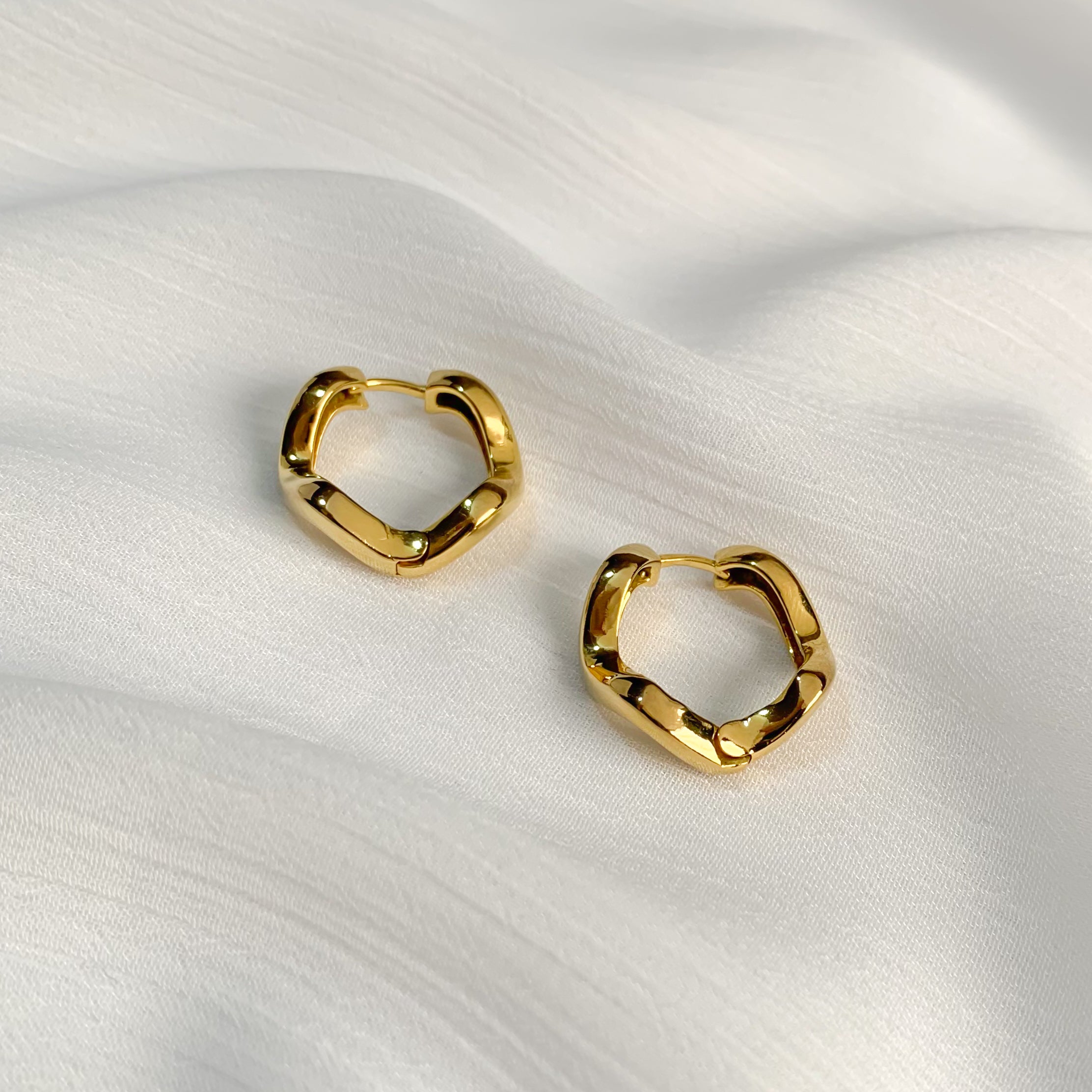 Argola feminina dourada com aspecto ondulado.