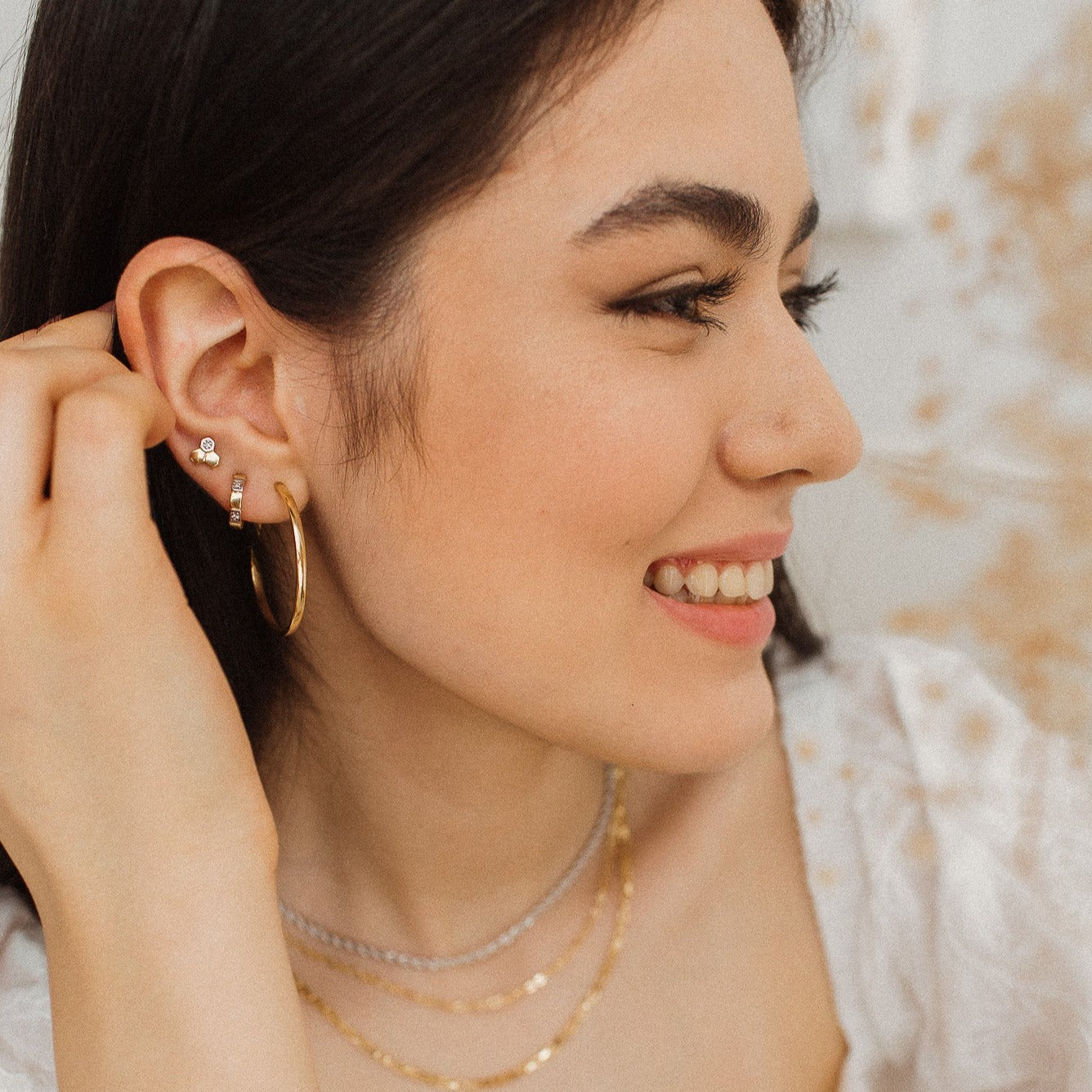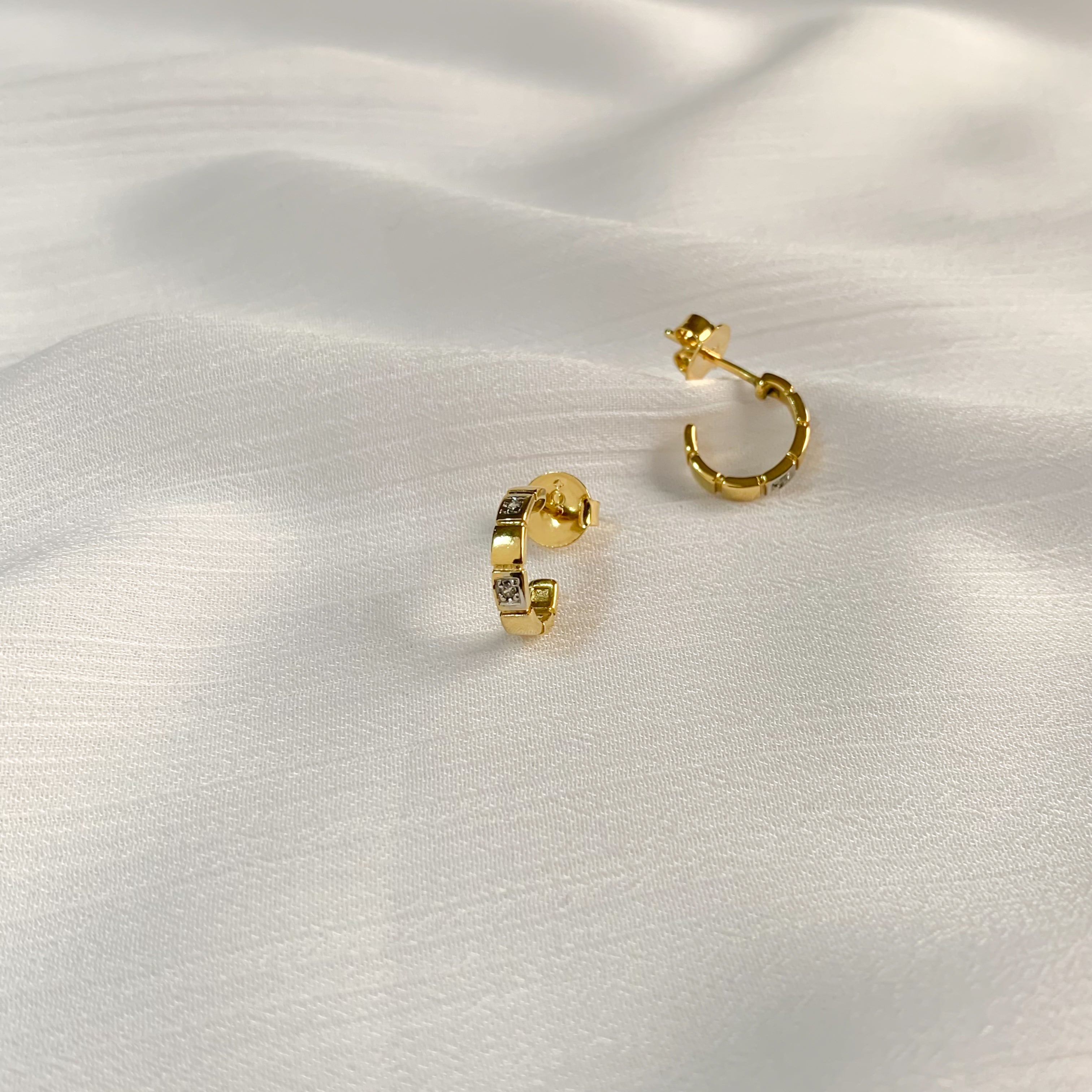 Argola feminino dourada com detalhe em ródio branco e micro zircônia cristal.