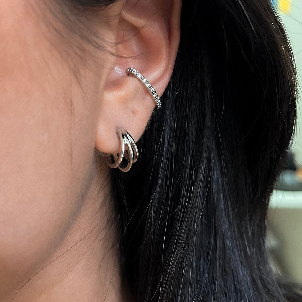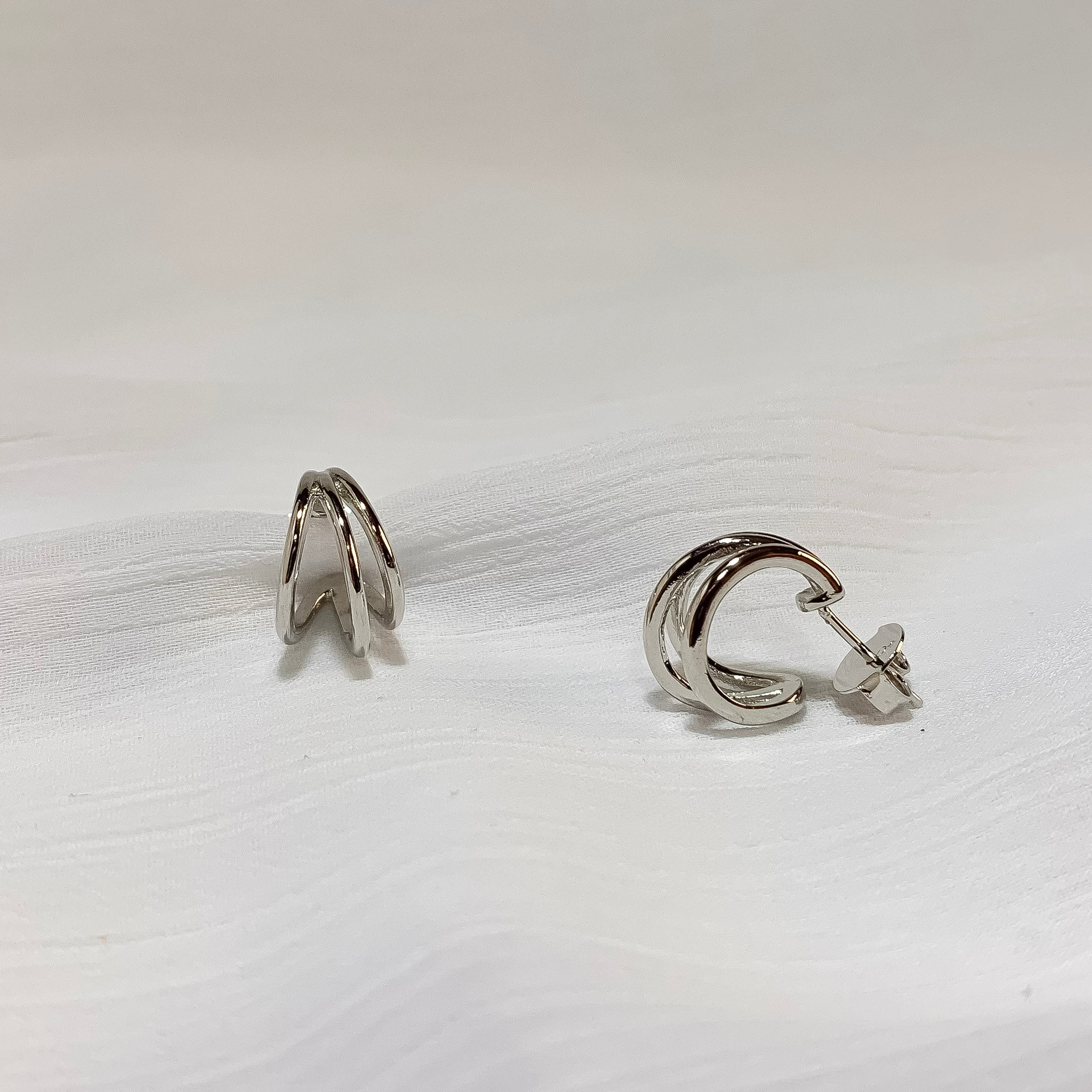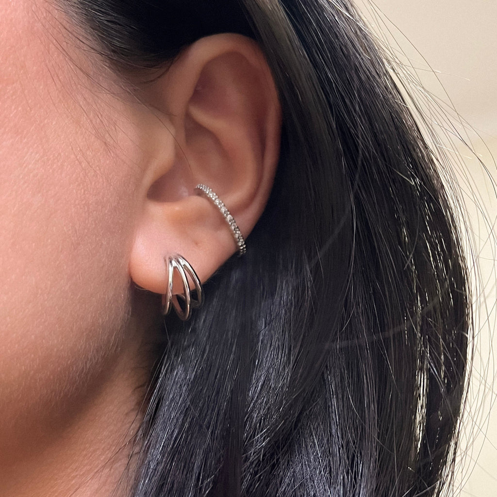 Argola feminina prateada com aspecto de trio de argolas. É uma boa opção para quem tem apenas um furo e quer um bricno com aspeco de mix.