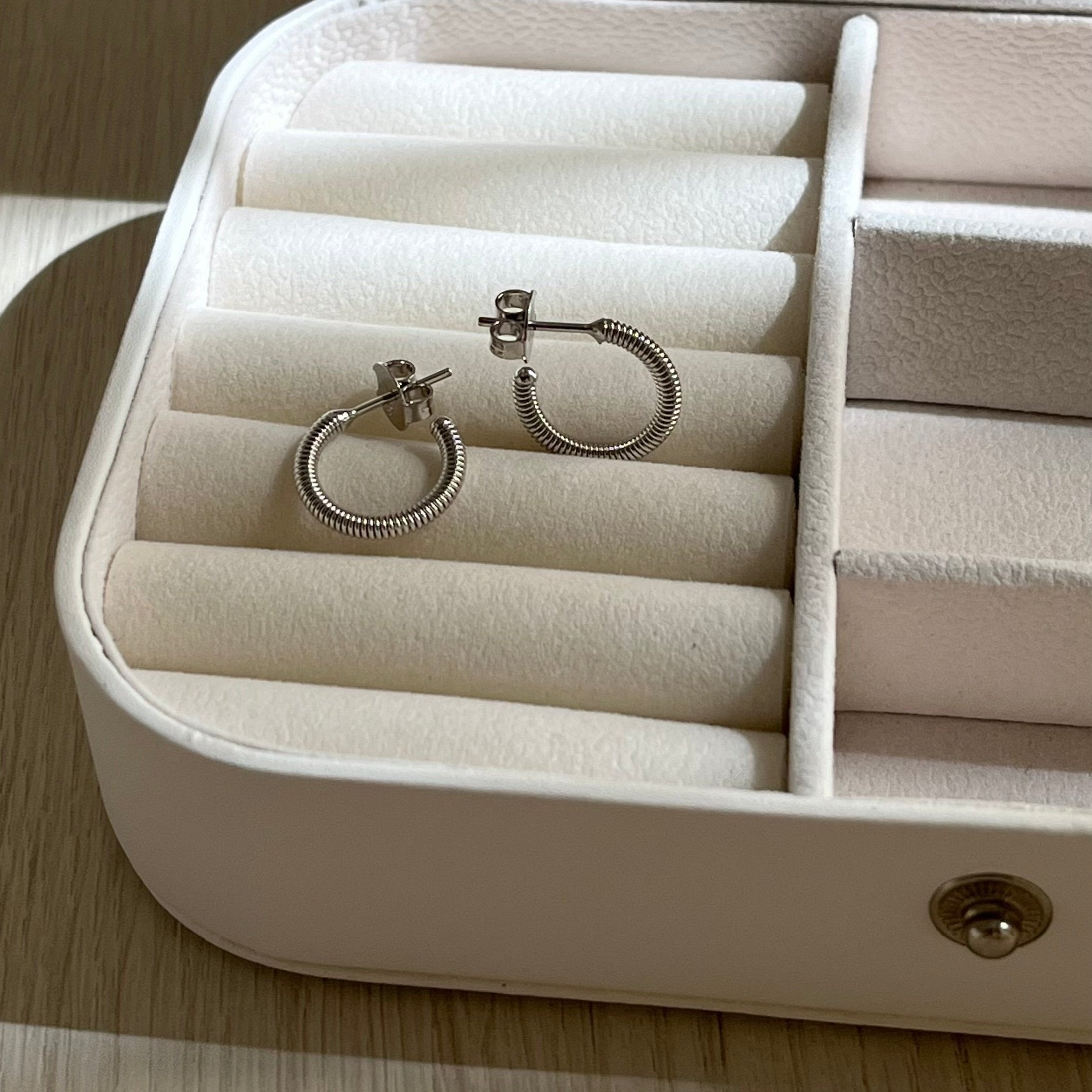 Argola feminina prateada com fio texturizado que confere um super brilho ao brinco.