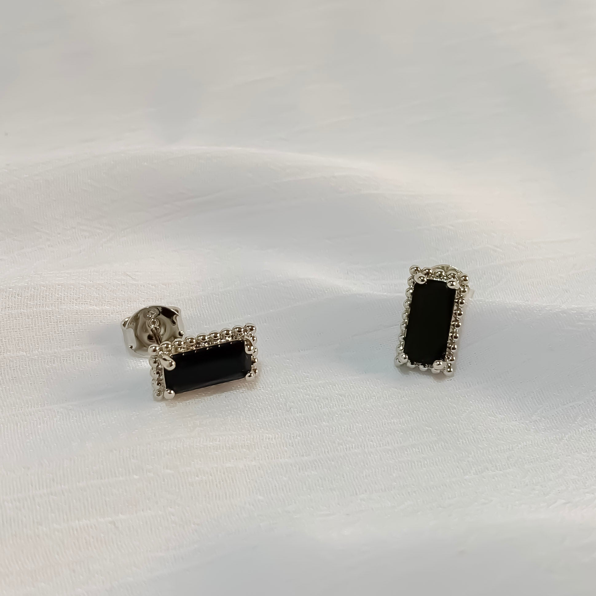 Brinco feminino prateado em formato retangular com zircônia preta.