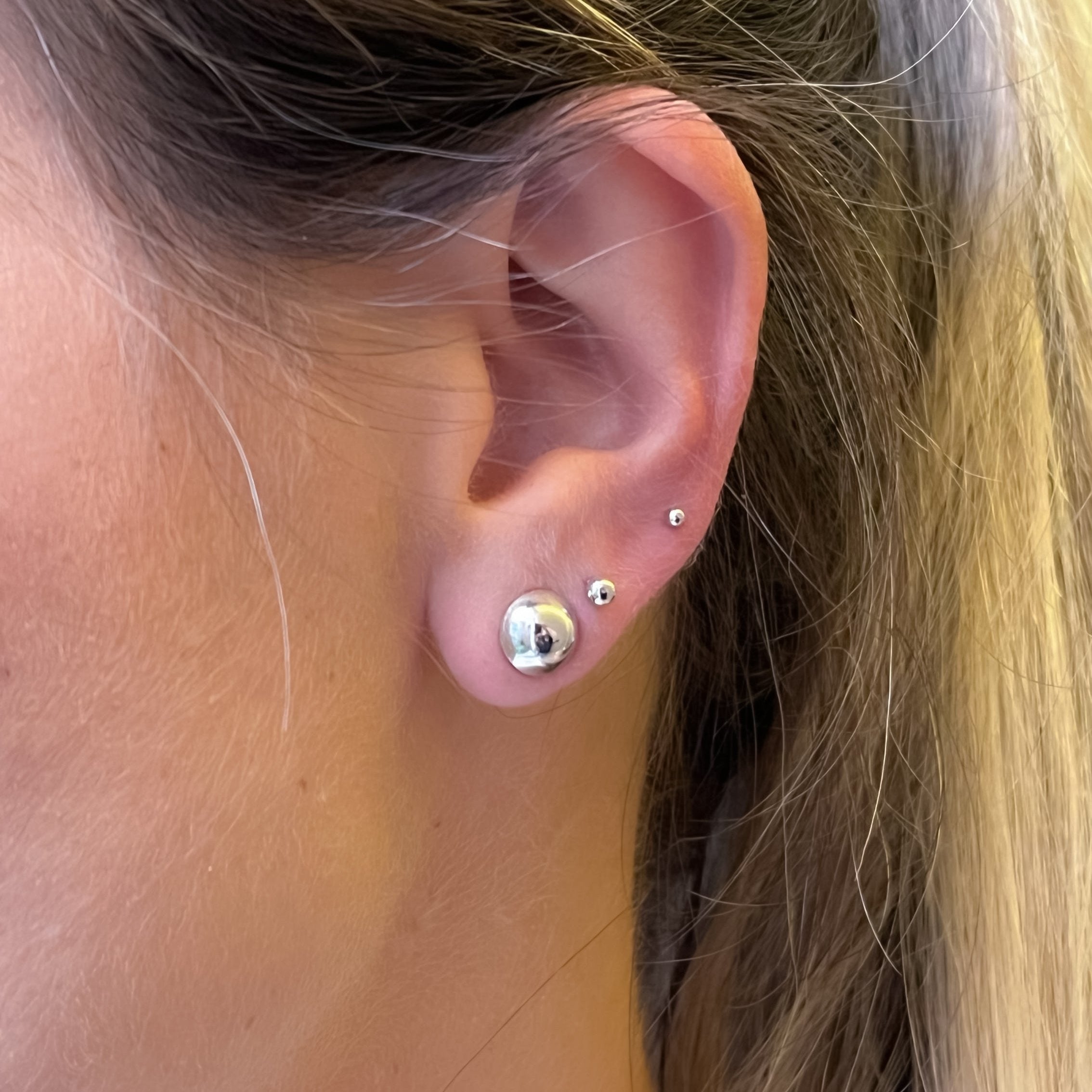 Brinco feminino prateado mini esfera metálica. Esse modelo possui pino curto para maior conforto ao usar como piercing.