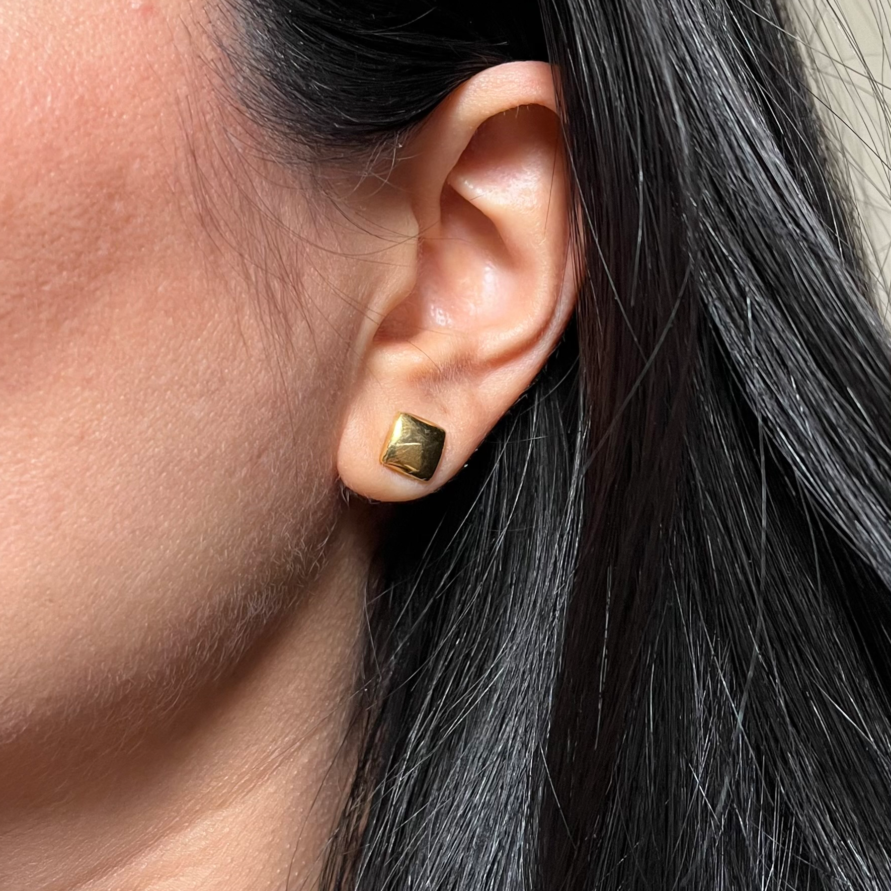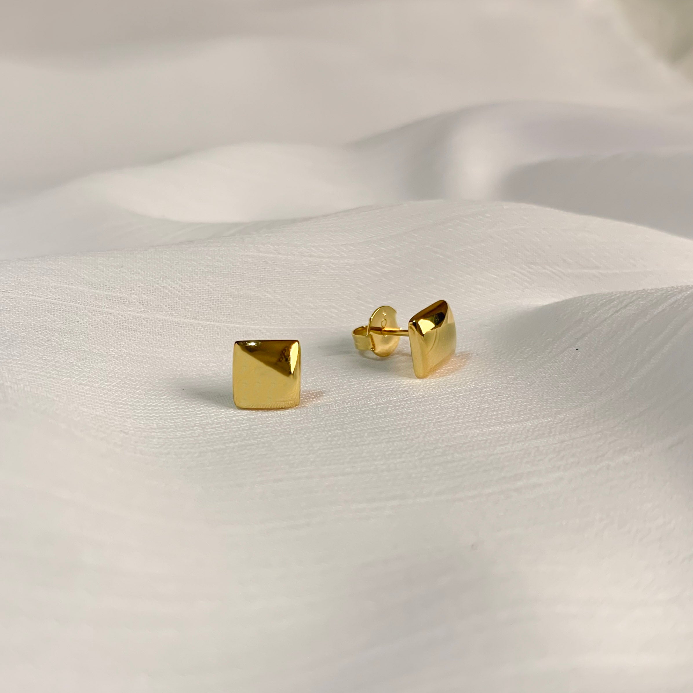 Brinco feminino dourado em formato quadrado. Acessórios com linhas retas comunicam praticidade, força e autoridade.