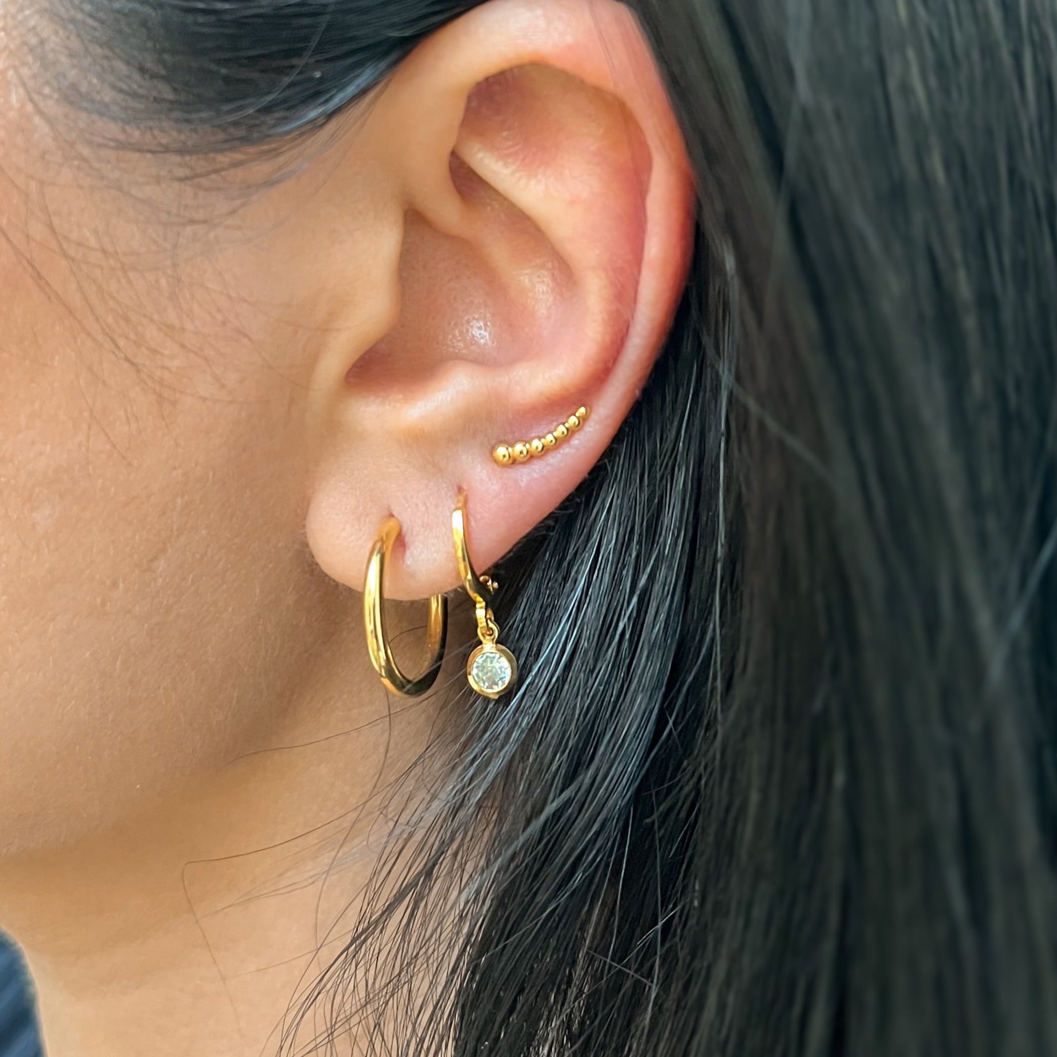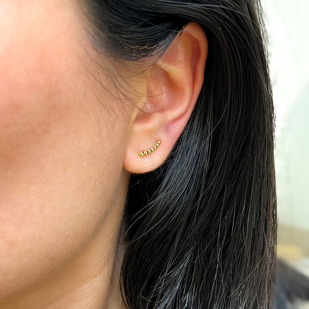 Brinco ear cuff dourado em forma de pequenas esferas. Modelo super delicado e moderno para ser usado no 1°, 2° ou 3° furo.