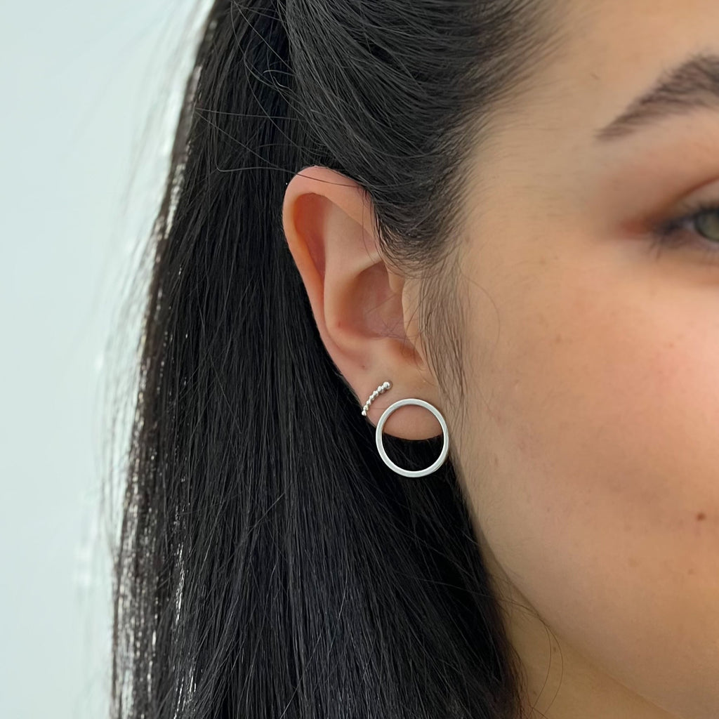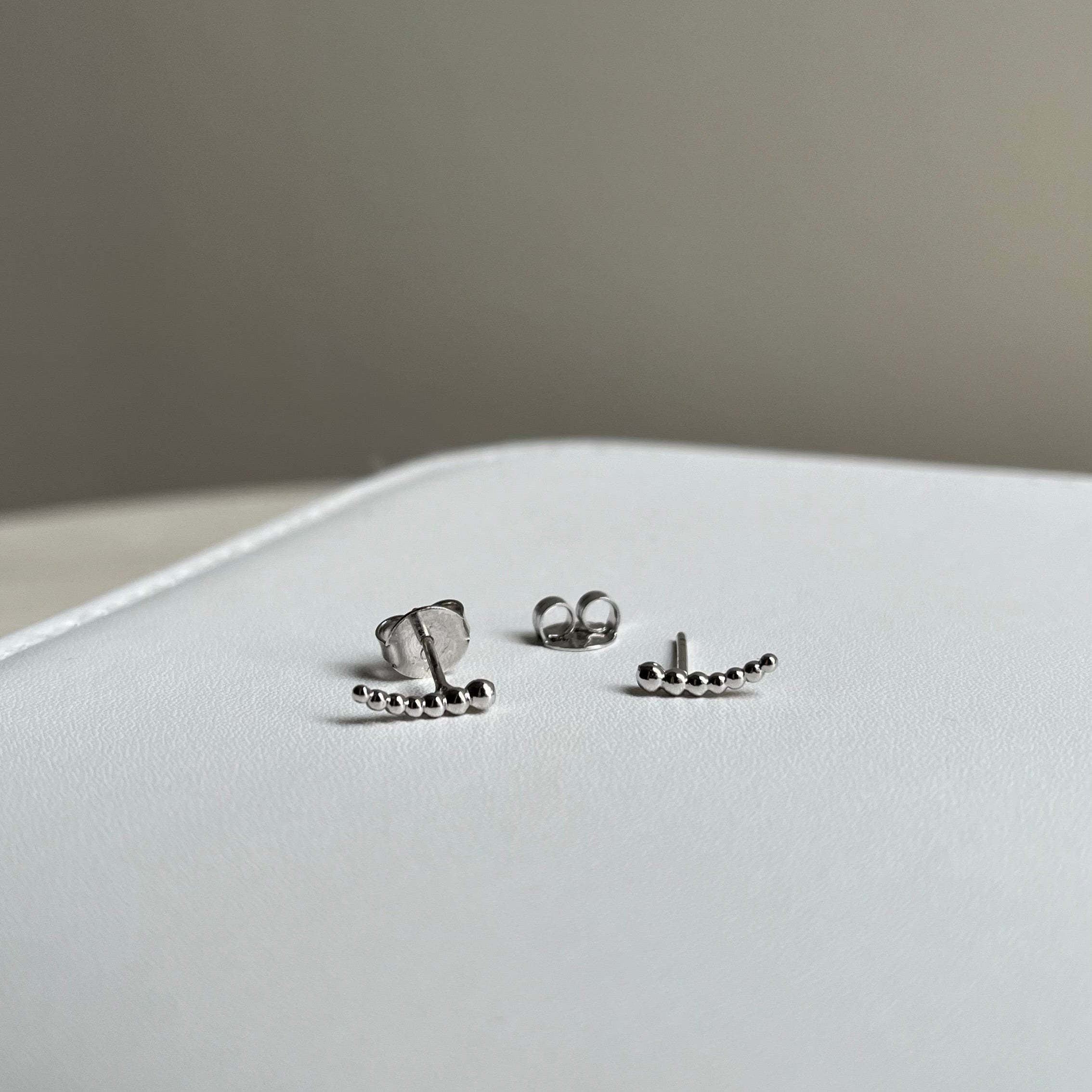 Brinco ear cuff prateado em forma de pequenas esferas. Modelo super delicado e moderno para ser usado no 1°, 2° ou 3° furo.