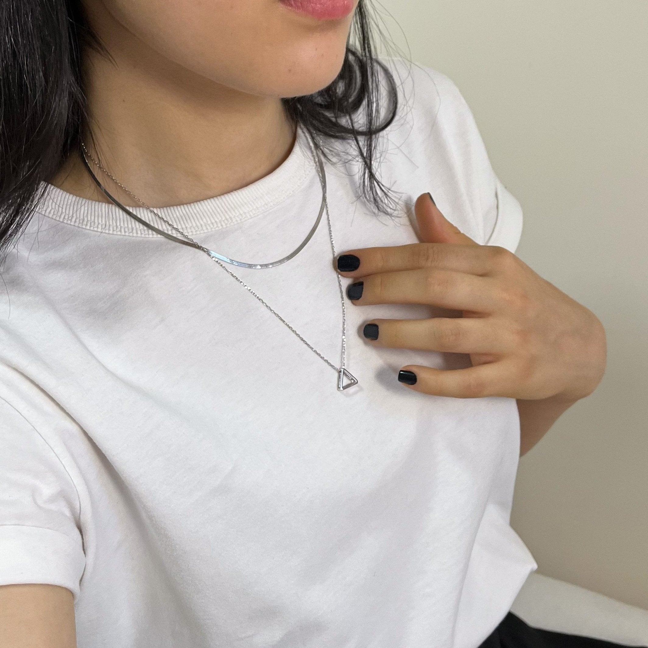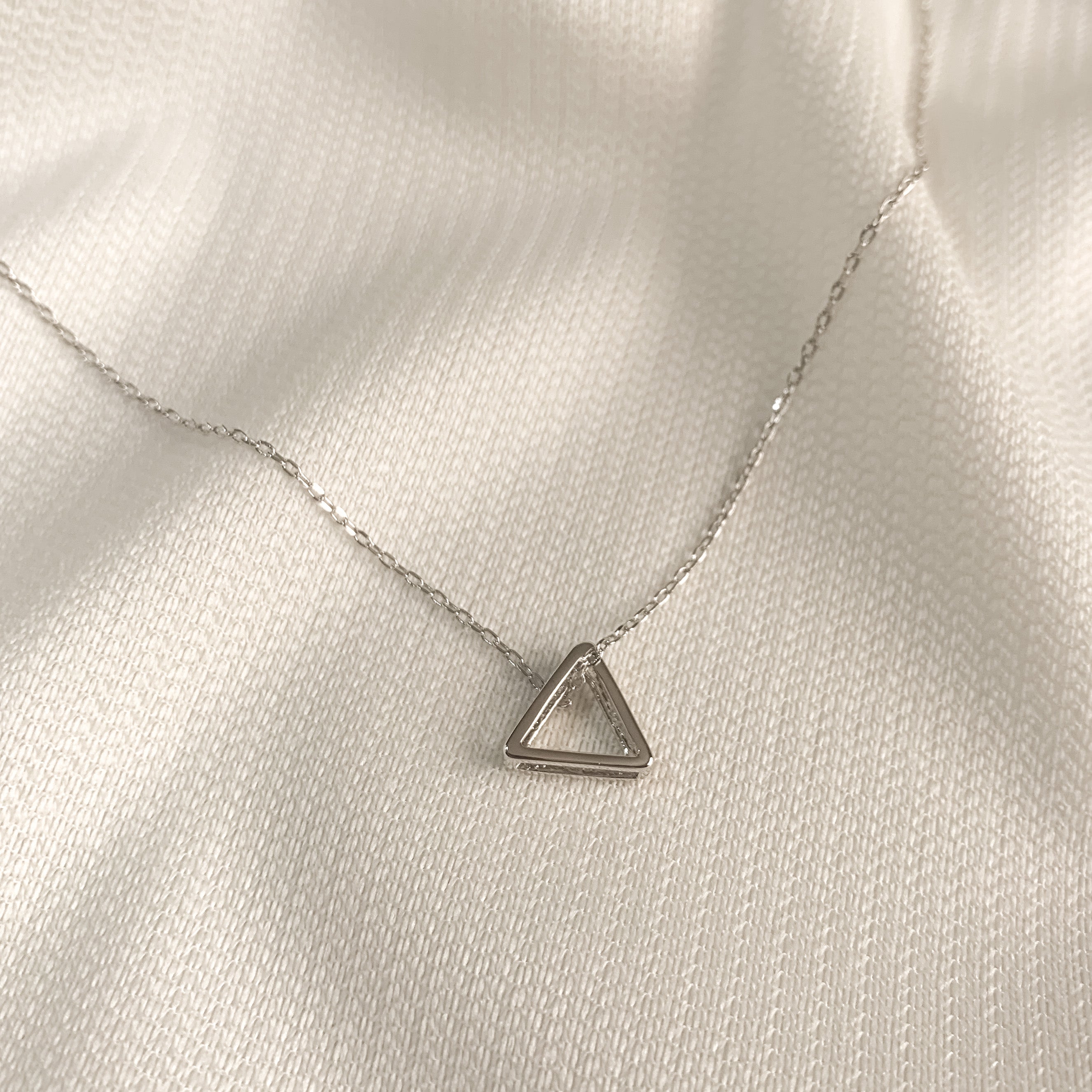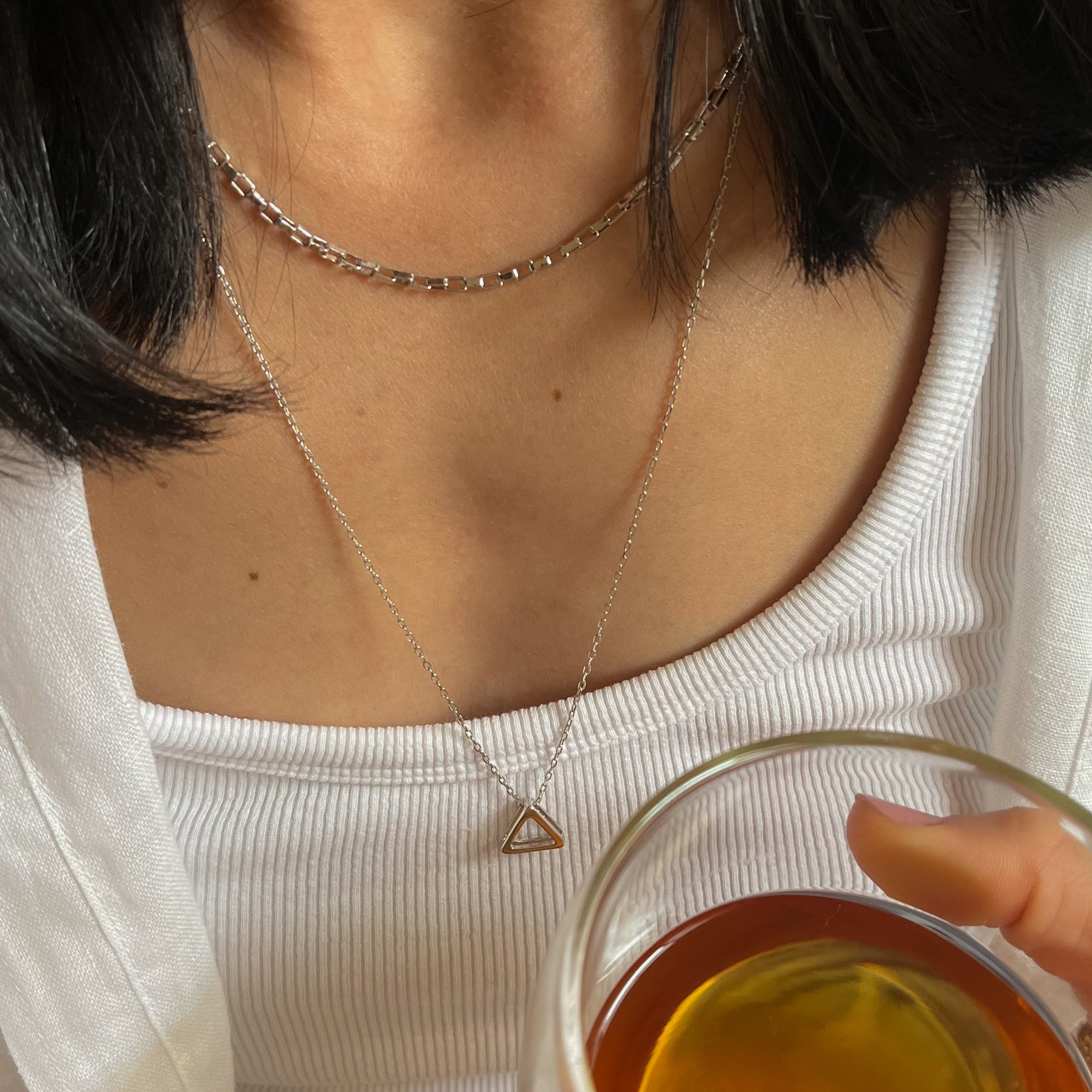 Colar feminino prateado com pingente em formato de triângulo. Ótimo modelo para dar um efeito alongador na silhueta e usar em composições com colares mais curtos.