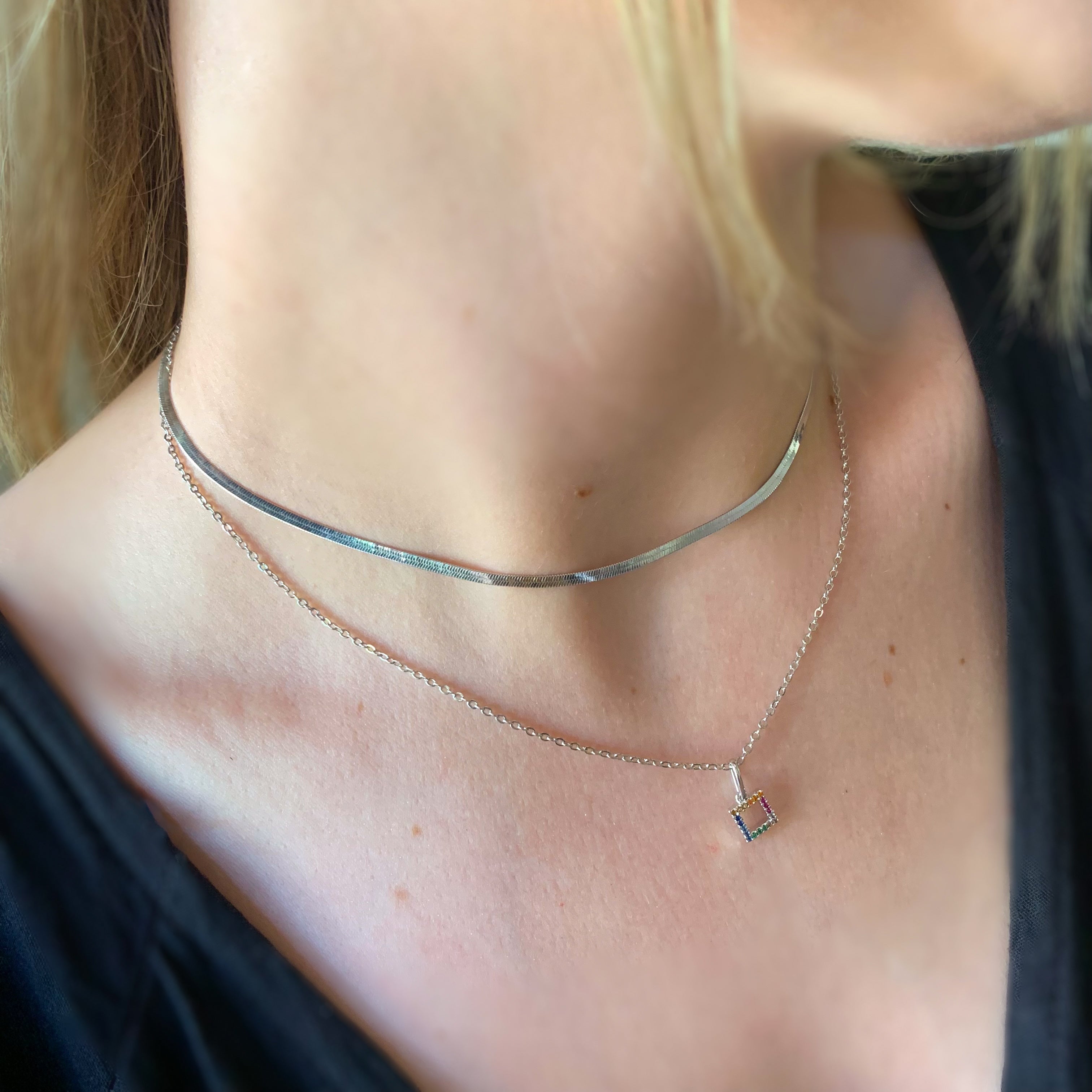 Colar feminino banho de ródio branco com pingente com formato quadrado cravejado com micro zircônias coloridas.