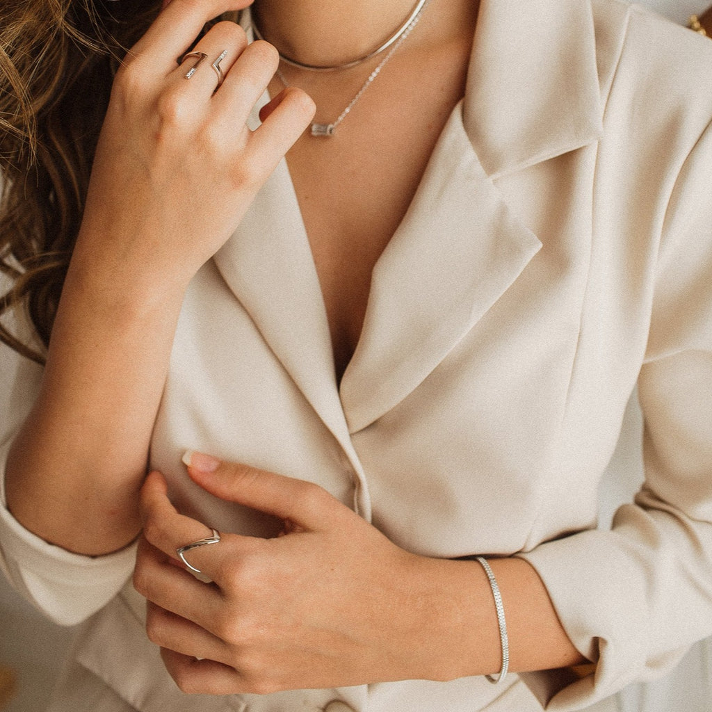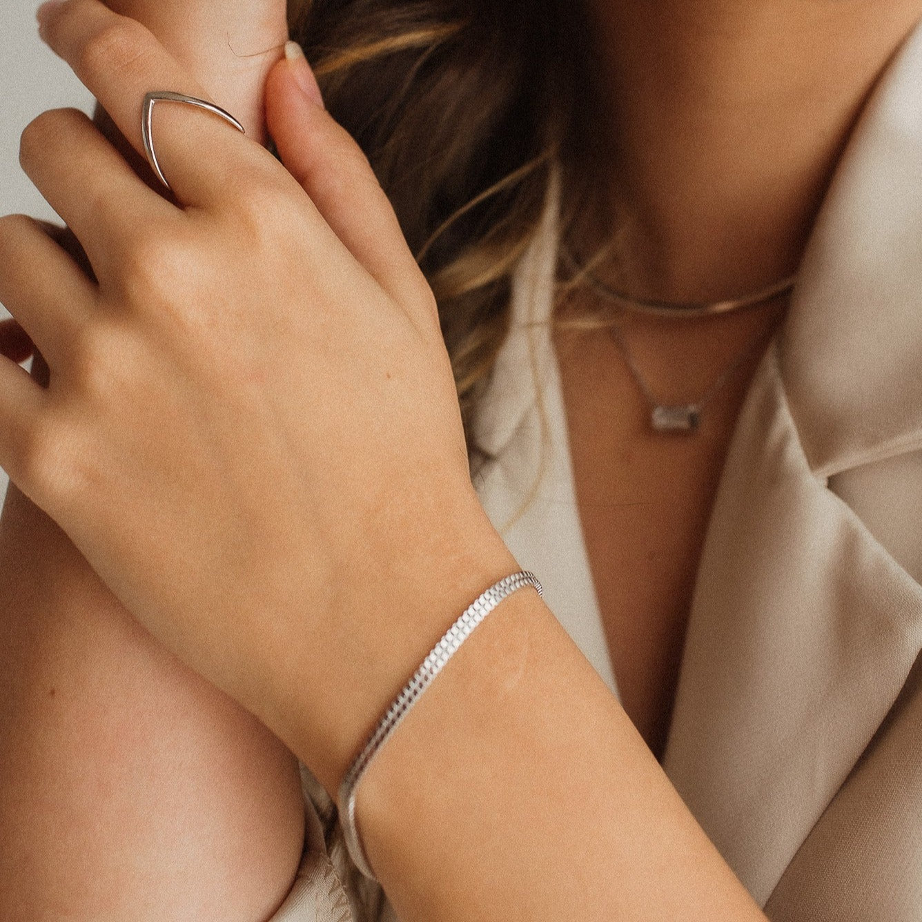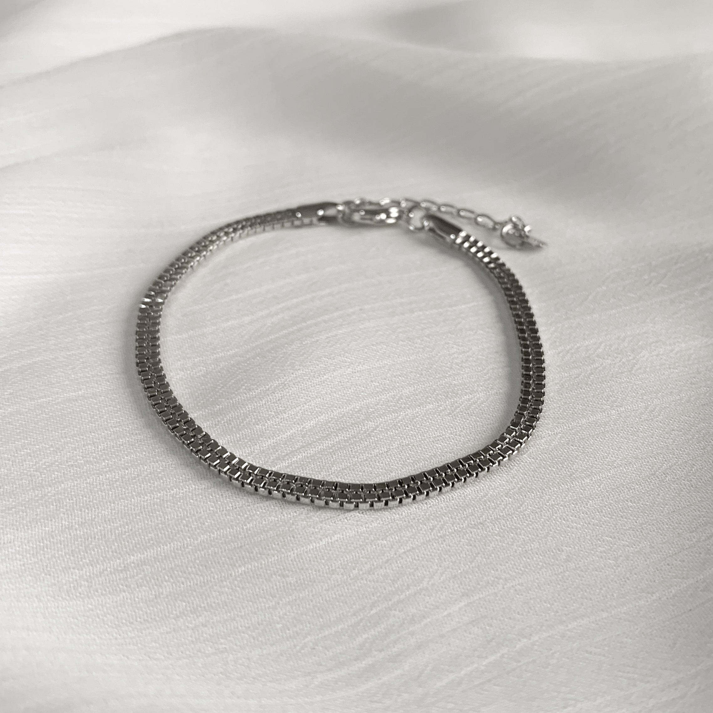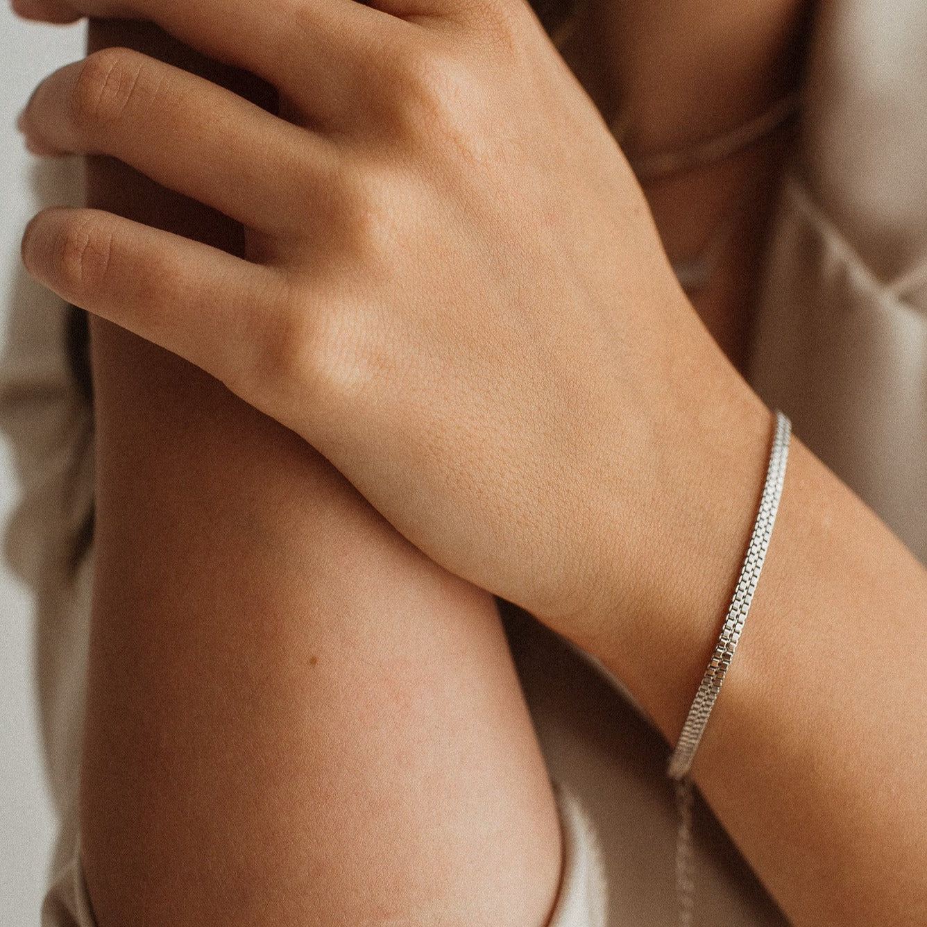 Pulseira feminina prateada com elos com aspecto quadriculado.