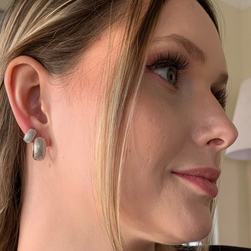 Argola feminino prateada com fecho click e aro mais largo com textura na superfície. Modelo super confortável e cheio de charme para aqueles dias que você não quer pensar muito no que vai usar. É possível versatilizar e usar a face lisa virada para frente.